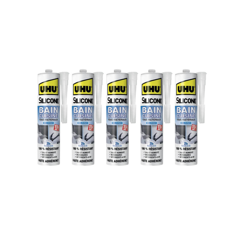 Un lot de 5 silicones mastic UHU Bain Cuisine 2H Blanc Cartouche - 300ml