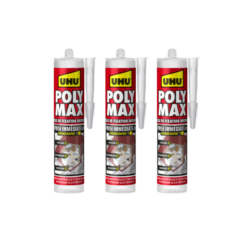 Un lot de 3 colles mastic Prise Immédiate Polymax UHU Invisible cartouche - 300 g
