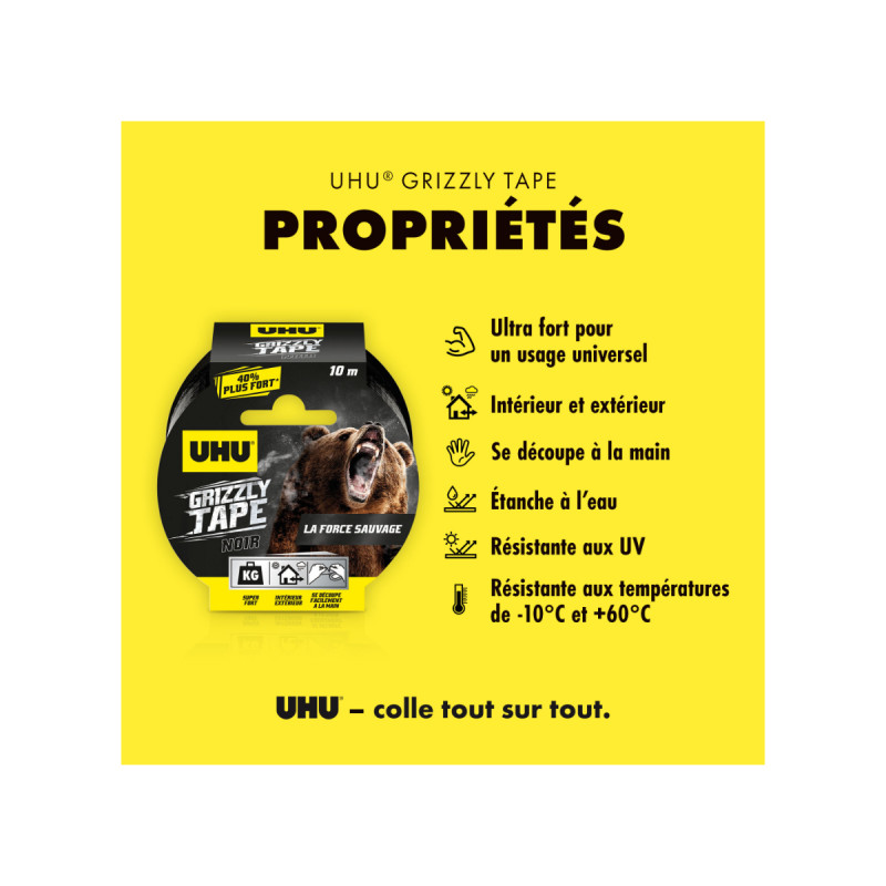Doté d’un support en PE extrudé, le ruban adhésif Grizzly Tape de UHU 34555 offre une excellente résistance face à la traction et aux intempéries. Épais et d’une adhérence extrême, ce ruban adhésif se déchire à la main dans les deux sens pour faciliter vos travaux. Il convient autant pour les travaux en intérieur que pour ceux en extérieur, avec une bonne résistances aux différentes conditions climatiques.