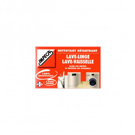 Le détartrant poudre IMPECA est biodégradable. Ce pack est composé de deux doses, chacune permet le nettoyage, l'entretien et la protection de votre lave-vaisselle ou lave-linge.
