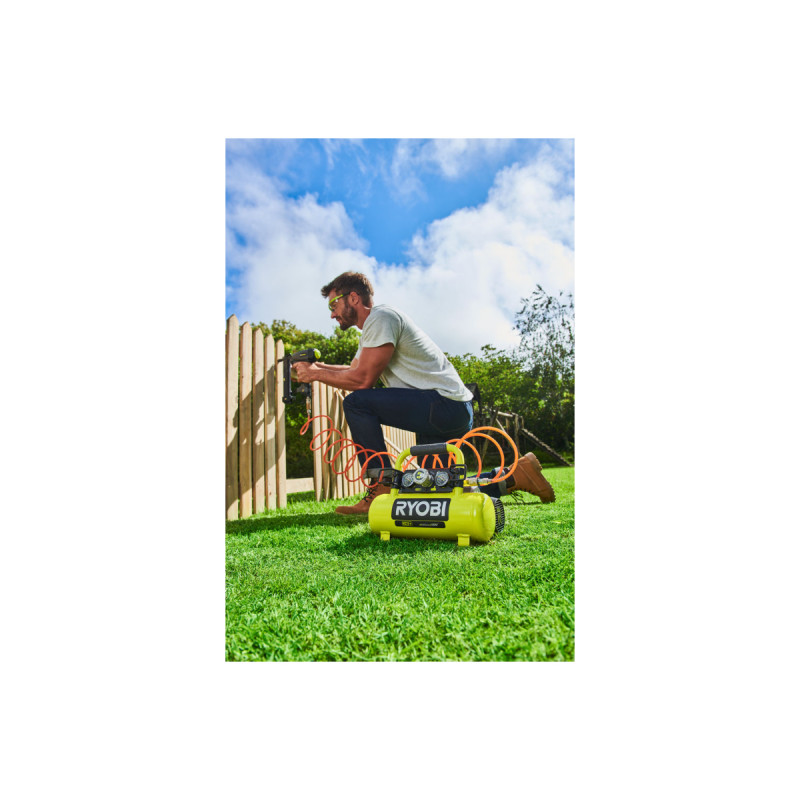 Pack RYOBI Compresseur à cuve R18AC-0 - 18V One Plus - 4L - 1 batterie 2.0Ah - 1 chargeur rapide RC18120-120, Gonfleur, compresseur idéal pour le gonflage des pneus. Batterie et chargeur rapide compris.