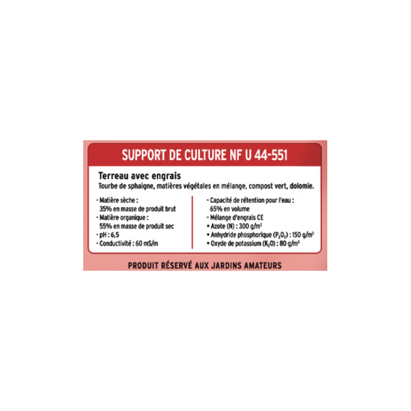 Ce terreau balcons terrasses FERTILIGÈNE - 6L convient parfaitement pour planter ou rempoter vos plantes fleuries comme les dipladénias, bégonias, géraniums, lierres, pélargoniums, sauge, pétunias... Sa formule enrichie en engrais favorise une floraison abondante des plantes.