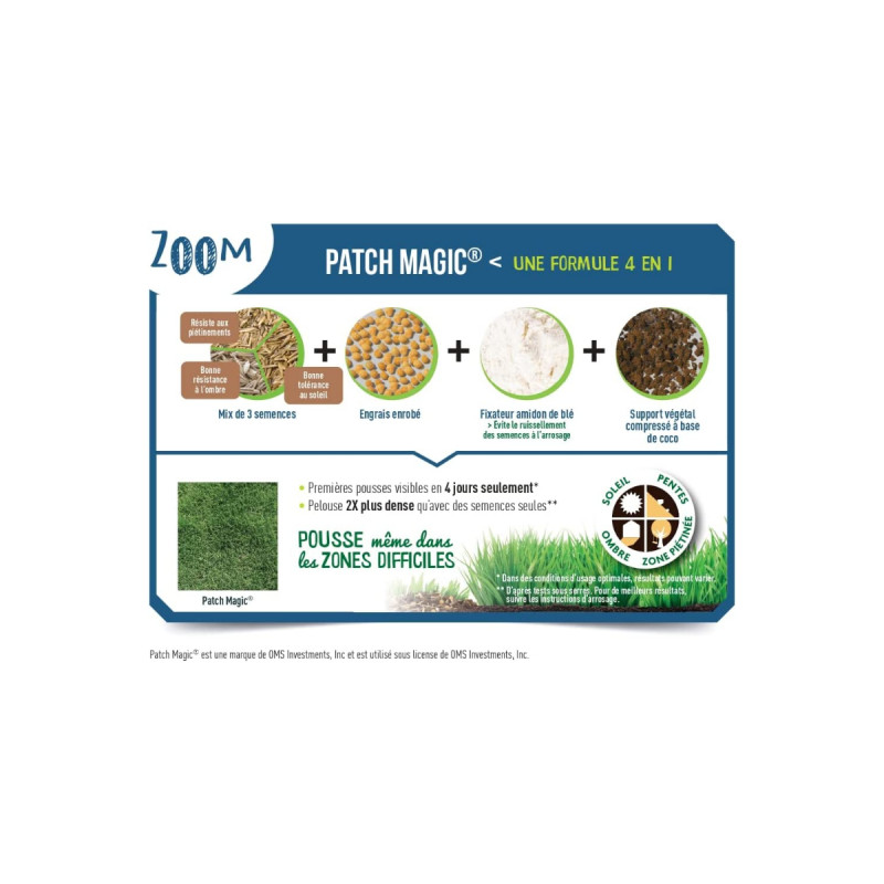 Le patch magic rénovateur gazon FERTILIGÈNE - 3,6kg est un rénovateur de pelouse efficace grâce à sa formule 4 en 1. Le mélange de 3 semences permet une pousse n'importe où, en plein soleil, à l'ombre ou sur les zones piétinées. La formule contient un mélange de 3 semences à installation rapide : un engrais, un fixateur et un support végétal compressé qui fonctionne comme une éponge et aide les semences à s'enraciner solidement. Obtenez un gazon dense en 4 jours et simplement : il vous suffit de semer et d'arroser.