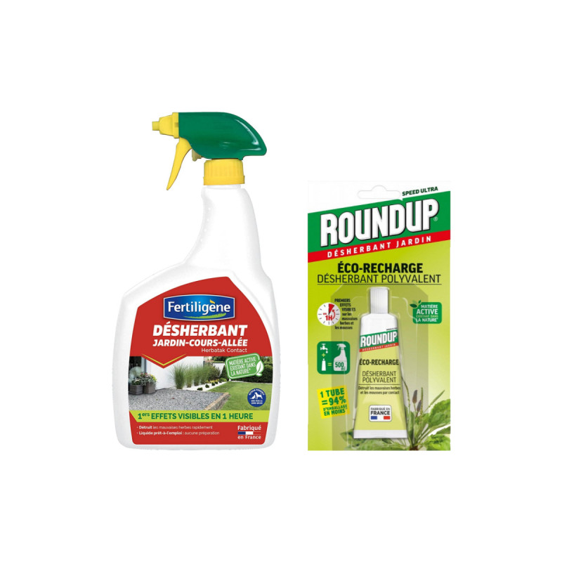 L'extérieur de votre maison est envahi de mauvaises herbes ? Ce pack spécial désherbage composé d'un désherbant FERTILIGÈNE de 900 ml et d'un éco-recharge désherbant polyvalent ROUNDUP de 23ml. Dans un premier temps, il est conseillé d'utiliser le désherbant FERTILIGENE puis lorsque celui-ci est vide, vous pourrez le remplir de nouveau grâce à l'éco-charge. Ainsi ces produits complémentaires pourront éliminer les mousses et mauvaises herbes par contact. Ce produit s'utilise sans préparation au préalable, et dans toutes les zones du jardin. Désherbez au pieds des arbustes ou massifs, avant de créer ou renouveler un potager ou une pelouse ; vous pouvez semer ou replanter 1 jour après application. Les premiers résultats sont visibles au bout d'1 heure seulement.