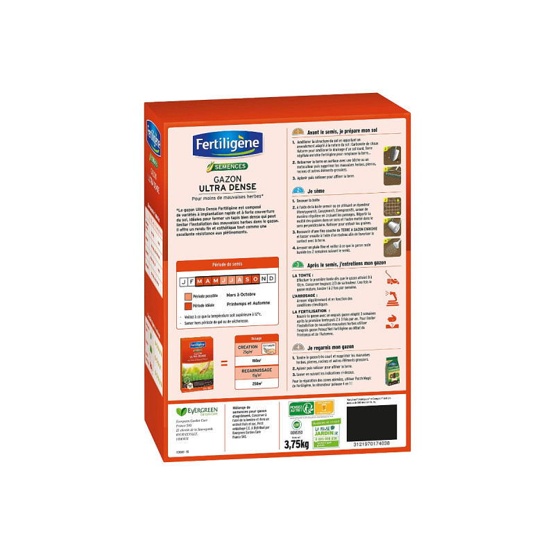Ce lot de 3 gazons ultra dense FERTILIGÈNE - 150m² - 3,75kg est composé de variétés à implantation rapide pour obtenir rapidement un gazon dense en réduisant les mauvaises herbes. La germination se fait en 7 jours, et le rendu est fin et esthétique tout en ayant une bonne résistance aux piétinements.