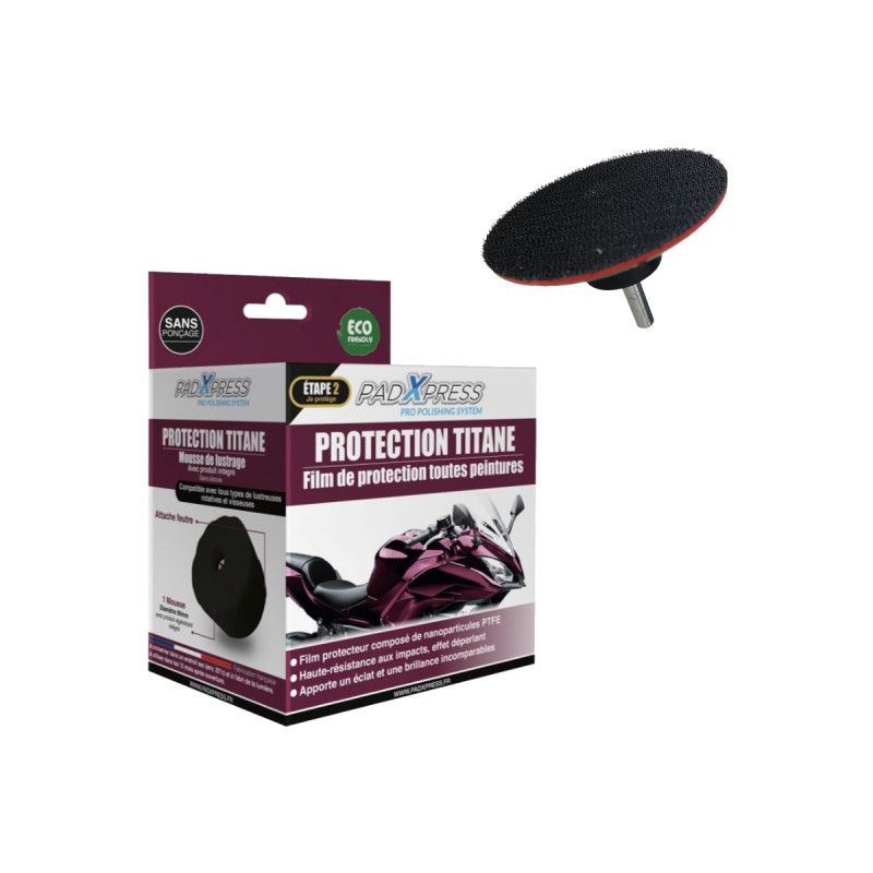 Si vous souhaitez parer le vieillissement de votre carrosserie, optez pour ce pack PadXpress Moto - Traitement titane - Plateau 80mm sera idéal. Il comprend un traitement titane qui permet de protéger la peinture avec ses propriétés déperlante, anti-adhérante et résistante à la pollution et aux projections routières. Il dépose un film protecteur pour une action longue durée compatible avec toutes les peintures. Professionnel ou particulier, vous pourrez utiliser facilement ce traitement titane qui se présente sous la forme d'une mousse avec réservoir intégré, avec un Pad qui se fixe à votre polisseuse, le plateau adaptateur est compris avec. Faite briller votre carrosserie en seulement 30 minutes, temps suffisant pour appliquer le traitement.