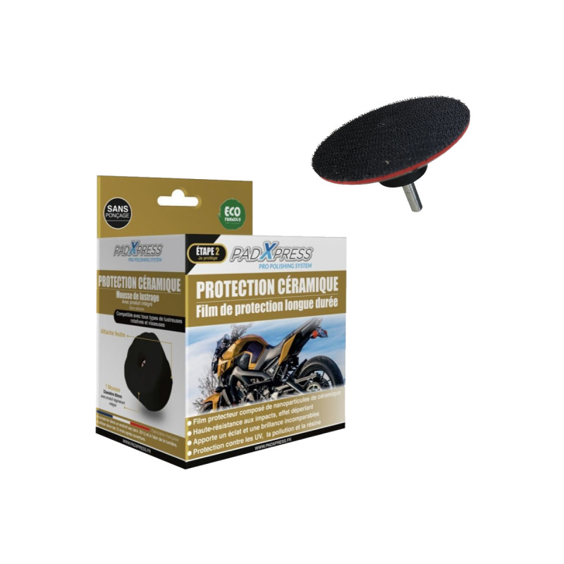 Le pack PadXpress Moto - Film protection céramique - Plateau 80mm vous sera utile pour protéger votre carrosserie des UV, des pluies acides, de la pollution, des résines et sèves mais aussi des impacts. Grâce au film protection composé de nanoparticules de céramique, ce produit garantit une haute résistance aux impacts et à tout type d'usure pouvant abimer votre carrosserie. Que vous soyez un professionnel ou un particulier, appliquez le facilement en seulement 30 minutes grâce à sa conception et au plateau compris dans le pack. C'est une mousse avec réservoir intégré qui s'attache directement sur votre polisseuse pour l'utilisation.