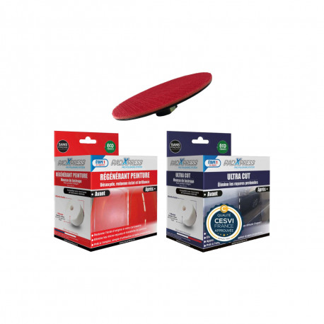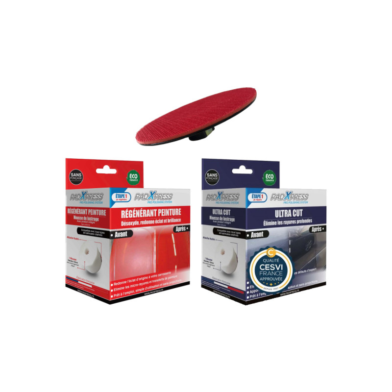 Le pack PadXpress Auto - Régénérant haute performance spécial peinture - Traitement Ultracut pour rayures profondes - Plateau 125mm est idéal pour rénover votre carrosserie. Le régénérant peinture et sa formule désoxydante et non-abrasive redonne vie à votre carrosserie tout en enlevant les micro-rayures qui s'y trouvent. Le traitement Ultracut lui, vient effacer les rayures plus profondes. Destinés à une utilisation domestique ou professionnelle, appliquez facilement les produits grâce à leur dispositif : une mousse avec un réservoir intégré, qui se fixe au plateau de votre polisseuse grâce au plateau de 125 mm spécialement adapté, inclus dans le pack.