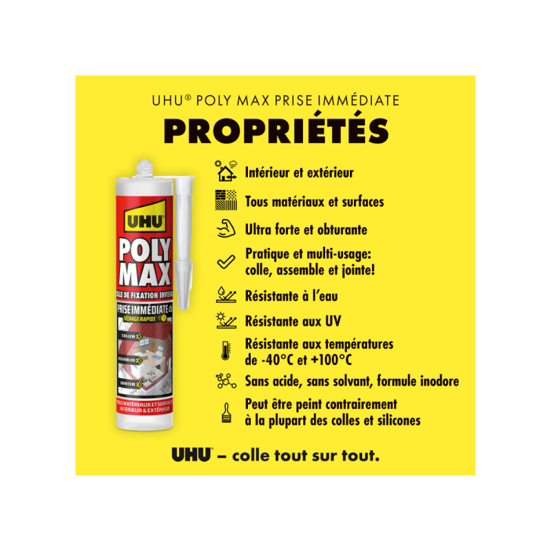 Ce lot de 12 colles mastics prise immédiate Polymax UHU Invisible cartouche - 300 g - 33883 convient pour le collage, l'étanchéité et le bouchage, avec une prise initiale très forte et une grande résistance rapide. Le produit s'utilise sur la grande majorité des matériaux (verre, pierre, fer, aluminium, acier et tant d'autres) et également sur des nombreux supports, qu'ils soient lisses, poreux ou non poreux. Après les travaux, la colle est inodore et invisible, en plus de disposer d'une résistance aux températures extrêmes, à l'eau, aux UV et aux intempéries.