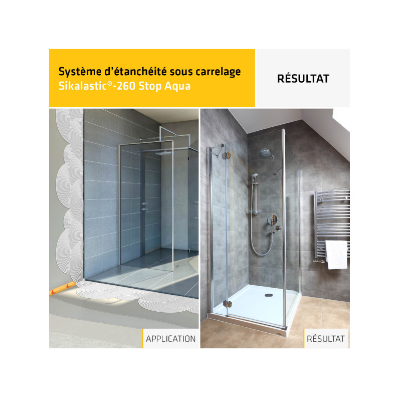 Ce revêtement d'étanchéité sous carrelage Sikalastic-260 Stop Aqua - 8m² - 22kg est un système prêt à l'emploi permettant de réaliser l'étanchéité sous protection dure rapprochée (carrelage, chape...) des planchers intermédiaires et des cloisons de tous les locaux humides sous protection dure. En effet, ce produit multi-surfaces peut être appliqué dans de nombreux lieux : locaux P3E3 (douches collectives, locaux sanitaire), P4/P4SE3 : cuisines collectives, locaux très humide (EC) piscine, laveries industrielles... Il forme après durcissement une membrane adhérente étanche, souple, résistante à la fissuration. Le produit est recouvrable rapidement par une protection dure comme du carrelage