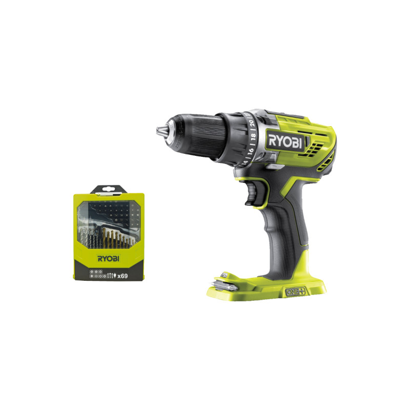 Ce pack RYOBI comprend une perceuse-visseuse R18DD3-0 - 18V One+ sans batterie ni chargeur, idéale pour réaliser différents travaux. Ces 2 vitesses mécaniques, vous permettront de réaliser tous vos travaux de perçage, y compris de gros diamètre, notamment grâce à son mandrin de 13 mm auto-serrant. Performant, l'appareil est doté de 22 positions facilement réglables. L'outil fonctionne avec une batterie de la gamme 18V One+ vendue séparément. Il est vendu avec un coffret 69 accessoires mixtes pour perçage et vissage RAK69MIX.