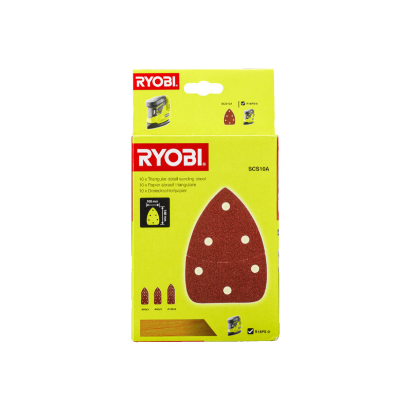 Ce pack RYOBI sera votre allié pour les tâches de ponçage légères à moyennes telles que la finition des surfaces, le décapage de la peinture, le meulage fin et les travaux de précision. La ponceuse triangulaire RPS18-0 - 18V One+ - sans batterie ni chargeur est à la fois compacte et puissante, elle est dotée d'un pommeau compact avec un revêtement GripZone micro-alvéolé, pour une prise en main ferme et confortable tout en assurant un maximum de précision. Une buse d'aspiration est fournie afin de l'adapter sur la ponceuse et laisser un espace de travail propre. L'appareil est livré avec 3 abrasifs. Elle fonctionne avec une batterie de la gamme Ryobi 18V One+ vendue séparément. Un lot de 10 feuille abrasive SCS10A - Grain 60, 80 et 120 est inclus dans le pack.