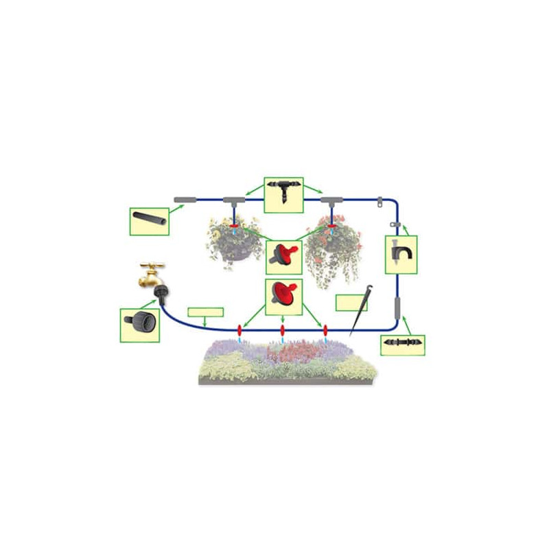 Kit de micro-arrosage 71 pièces Silverline 592716 avec tuyau économique en eau très simple à installer. Ce kit convient pour les plates-bandes, les pots, les serres, etc. Ce système d'arrosage économique peut-être utilisé pendant les restrictions d'arrosage. Le tuyau se coupe à la taille requise.