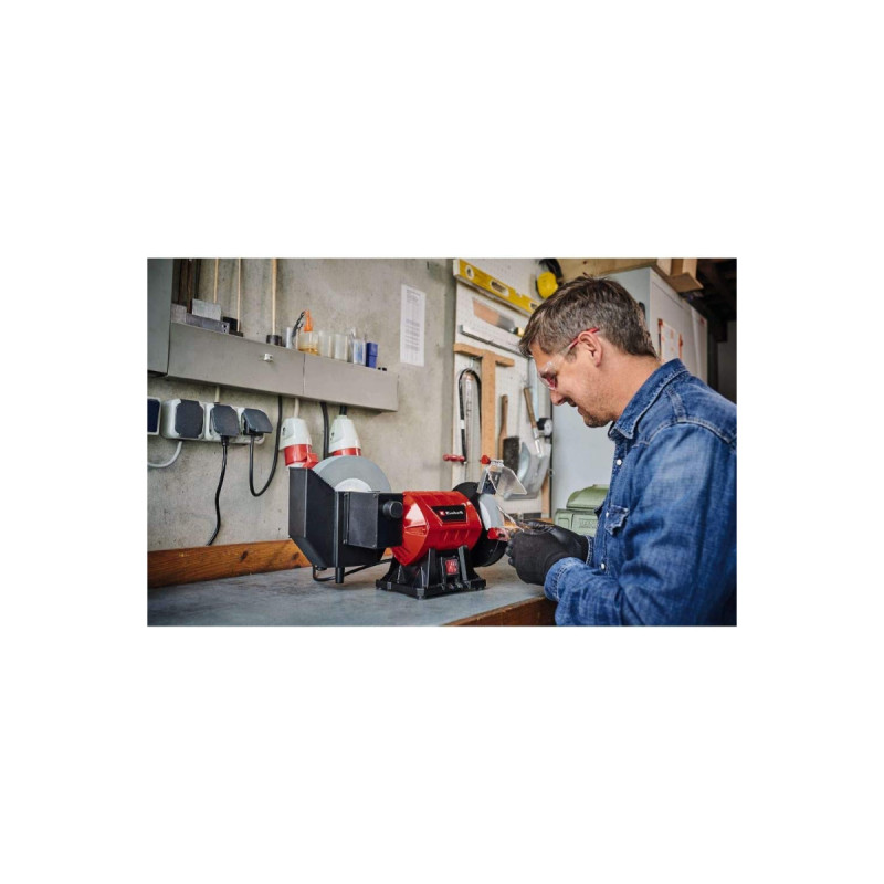 Ce pack EINHELL - Touret d'affûtage à eau ou à sec - TC-WD 200/150 - 250W - Meule - 200mm - Grain 60 permet de réaliser un affûtage en conditions humides ou sèches. Il convient pour l'affûtage de lames de tous types, les forets, ciseaux ou couteaux. L'outil garantit un résultat précis grâce aux arbres porte-meules montés sur roulement à billes sans jeu, et les quatre patins en caoutchouc qui amortissent les vibrations pour un maximum de stabilité. Le bâti métallique résistant et compact assure une longue durée de vie de l'outil, ainsi que le réservoir d'eau qui est en matériaux anticorrosion. Pour un travail en toute sécurité, l'outil dispose d'un pare-étincelle réglable sans outil et de capots de protections sur les côtés. Deux meules sont fournies : une à gros grains et une à grains fins et rotation lente. La meule supplémentaire incluse dans le pack vous permettra de poncer le métal.