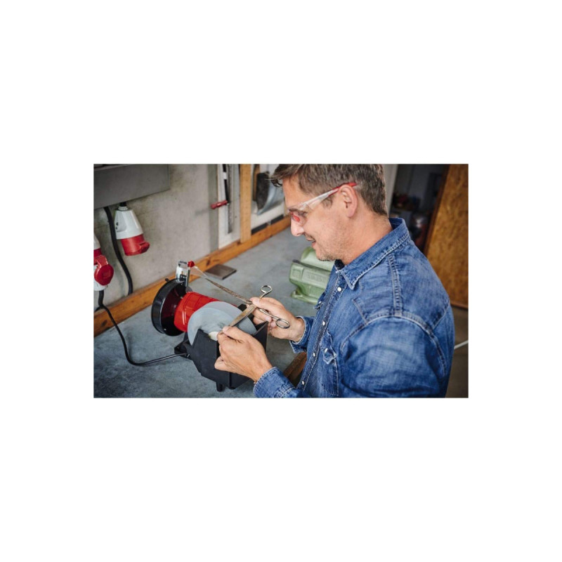 Ce pack EINHELL - Touret d'affûtage à eau ou à sec - TC-WD 200/150 - 250W - Meule - 200mm - Grain 36 permet de réaliser un affûtage en conditions humides ou sèches. Il convient pour l'affûtage de lames de tous types, les forets, ciseaux ou couteaux. L'outil garantit un résultat précis grâce aux arbres porte-meules montés sur roulement à billes sans jeu, et les quatre patins en caoutchouc qui amortissent les vibrations pour un maximum de stabilité. Le bâti métallique résistant et compact assure une longue durée de vie de l'outil, ainsi que le réservoir d'eau qui est en matériaux anticorrosion. Pour un travail en toute sécurité, l'outil dispose d'un pare-étincelle réglable sans outil et de capots de protections sur les côtés. Deux meules sont fournies : une à gros grains et une à grains fins et rotation lente. La meule supplémentaire incluse dans le pack vous permettra de poncer le métal.