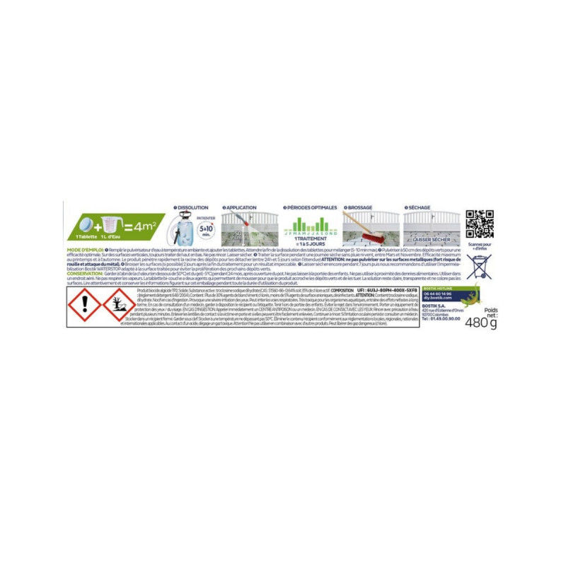 Ce traitement anti-dépôts verts BOSTIK WATERSTOP - 30 tablettes est indispensable pour rénover l'extérieure de votre maison et lui redonner de l'éclat. En effet, grâce à sa formule en chlorine, ce traitement pourra éliminer les dépôts verts tels que la mousse, le lichens ou les algues. Il est à dissoudre directement dans un pulvérisateur ou un spray. Ce produit multi-surfaces peut s'appliquer sur les toitures (ardoises, tuiles...), les façades (pierres, enduits, maçonnerie), les sols (allées et terrasses), les matériaux PVC (gouttières, portails, fenêtres..) mais également les décorations en pierre. Néanmoins, le produit ne doit pas être pulvériser sur les surfaces métalliques.