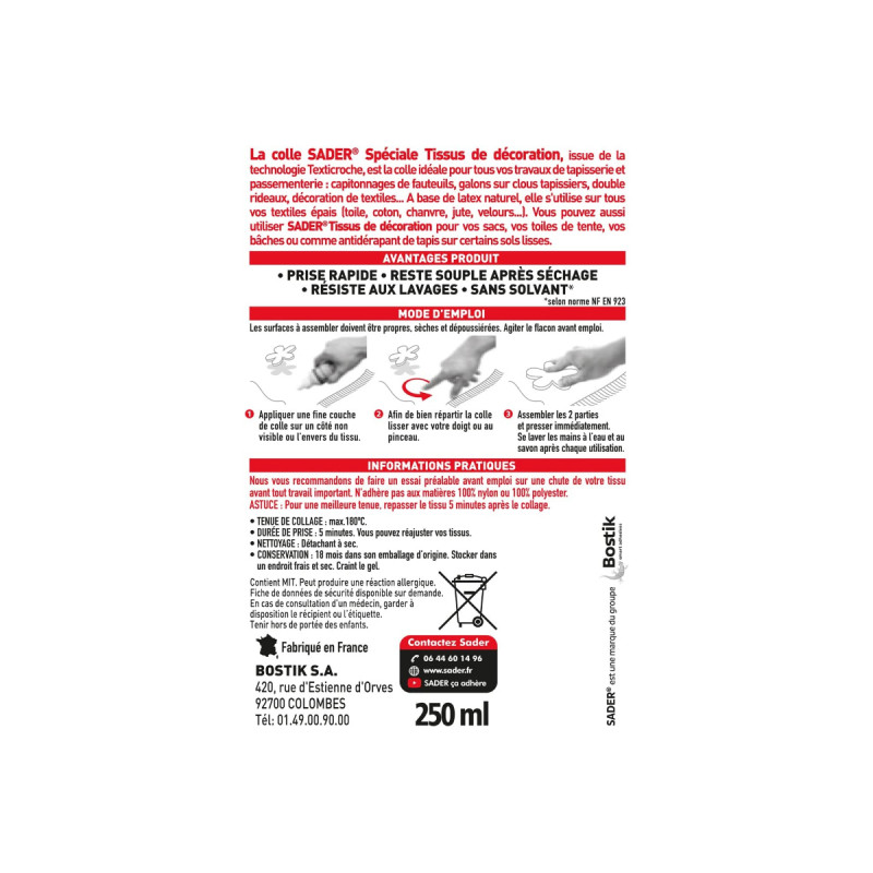 Cette colle tissus et textiles SADER - Finis les ourlets - Biberon 250ml vous permettra de coller durablement vos tissus naturels ou synthétiques (jean, cuir, coton). Elle est idéale pour vos travaux de couture, que ce soit des ourlets, de la customisation ou encore du rapiéçage. Cette colle à base de latex naturel est résistante au lavage et au repassage, elle est incolore après séchage et reste souple grâce à sa formule sans solvant à prise rapide.