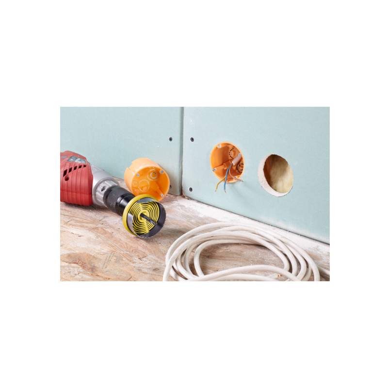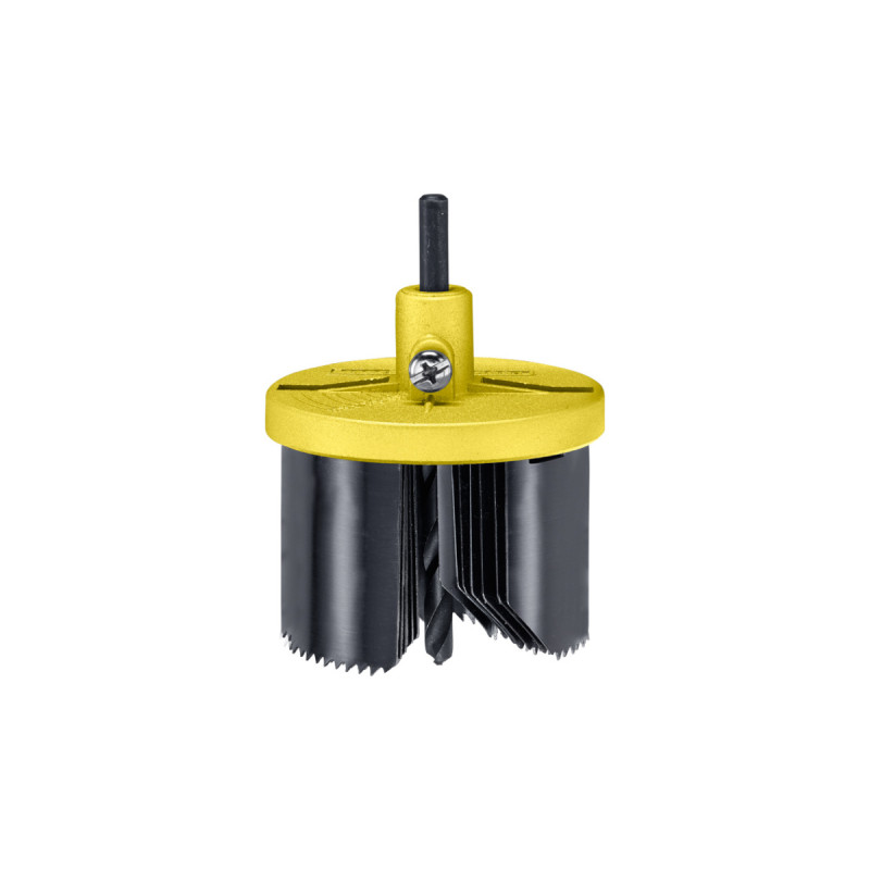 La scie trépan 7 lames KWB - 25-63 mm - 40 mm dispose de 7 couronnes différentes afin de s'adapter à vos besoins. Ces scies ont un diamètre de 25, 32, 38, 45, 50, 58 et 63 mm, avec chacune une profondeur de coupe de 44 mm. Le plateau de support a été conçu en aluminium pour obtenir un maintien sûr des lames. À utiliser avec une perceuse rotative classique ou encore une perceuse à percussion. Cette scie à trépan convient pour du perçage dans le bois, les panneaux légers, le placoplâtre et les panneaux de particules.