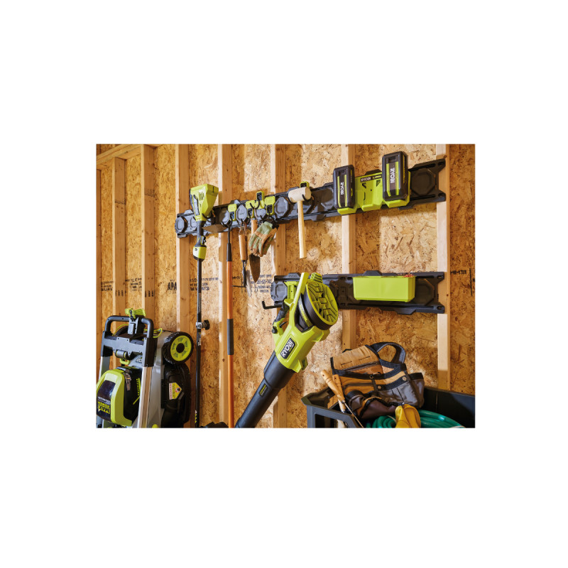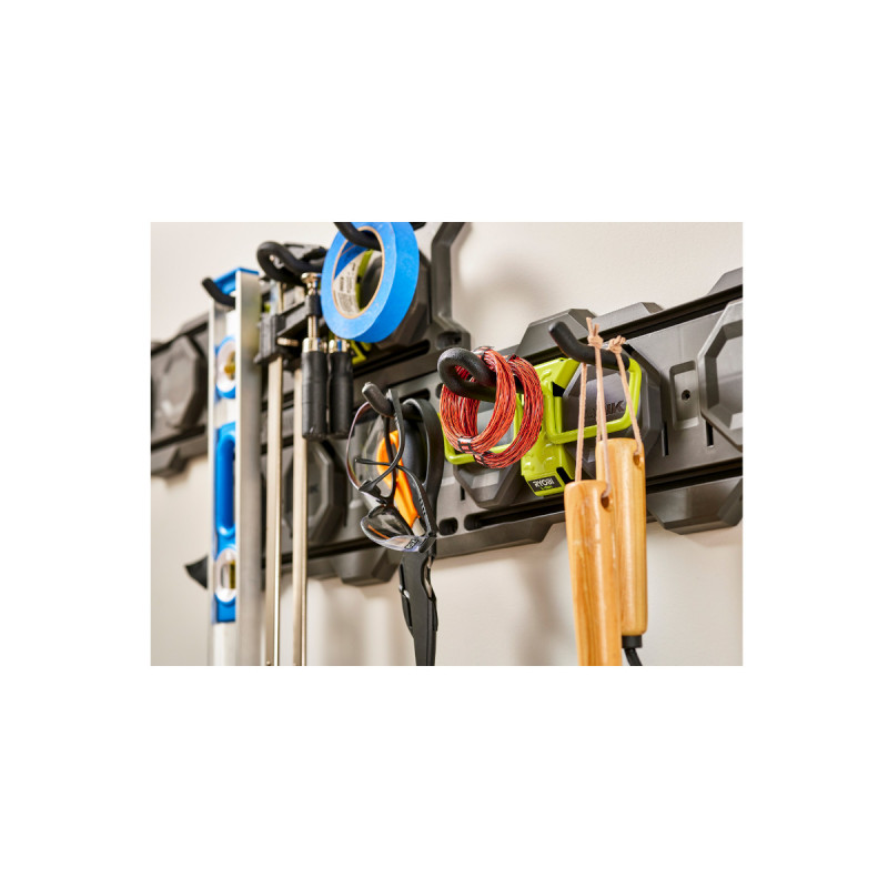 Le pack RYOBI Système LINK 4 rails muraux - Étagère - Organisateur - Crochet double - 2 Crochets simple - Bac simple et double regroupe 11 éléments pour s'équiper de manière efficace et commencer à profiter des possibilités du système LINL. Les 4 rails muraux servent d'éléments principaux et se fixent facilement aux murs grâce aux languettes prévues à cet effet. Vous pourrez ainsi y greffer dessus les produits pour ordonner votre atelier ou votre garage. L'étagère possède différents espaces de formes différentes pour assembler au même endroits des outils ainsi que des accessoires. L'organisateur composé de différents compartiments amovibles afin de pouvoir ordonner vos consommables ou vos accessoires comme vous le souhaitez. Le crochet convient pour suspendre des outils, qu'ils soient électroportatifs ou à main, comme un souffleur ou encore une pelle. Il peut supporter une charge allant jusqu'à 22,7 kg. Le crochet double est, quant à lui, idéal pour suspendre divers outils à main ou d'autres objets, avec un support de charge allant jusqu'à 22,7 kg. Enfin, le bac simple et celui double sont compatibles avec des caisses, des boîtes de rangement et qui peut également se fixer directement sur des rails. Vous pourrez ranger à l'intérieur des consommables, comme de la visseries, et également des petits objets.