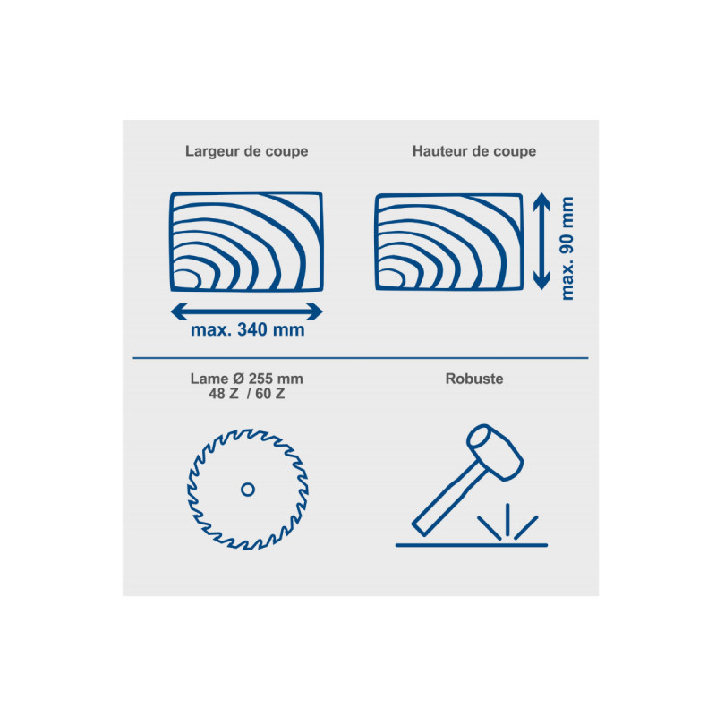 • Lame : 255 mm et 60 dents (lame 48 dents incluse également)