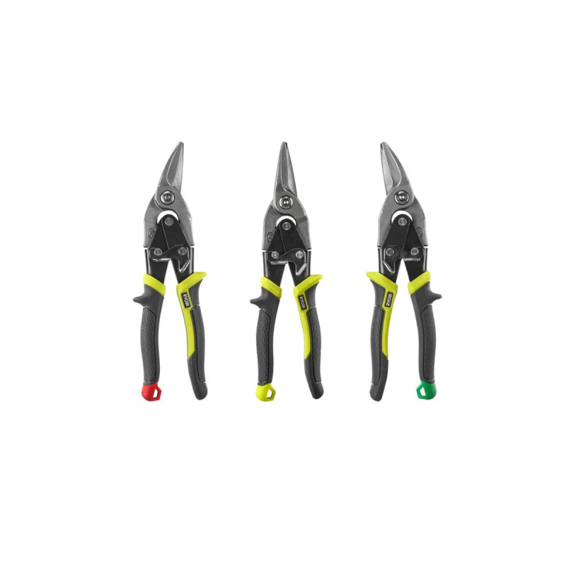 Le jeu de 3 cisailles aviation RYOBI - RHAS3PC comprend une cisaille pour des coupes droites, une pour des coupes à gauche et une autre pour des coupes à droite. Vous pourrez ainsi travailler sur du métal, de l'acier, du cuivre ou encore du cuir et effectuer des coupes avec des formes si vous le souhaitez. Les lames sont conçues en chrome molybdène forgé afin d'avoir une meilleure durabilité et un boulon de verrouillage empêcheront qu'elles se desserrent. Les différentes cisailles sont faciles à reconnaître grâce au code couleur.