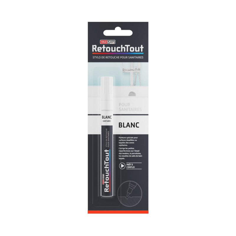 Le stylo retouche sanitaires SOLOPLAST - Blanc - 10ml, idéal pour faire des retouches rapides sur des surfaces émaillées, comme un lavabo, un meuble de salle de bain ou encore de la porcelaine.