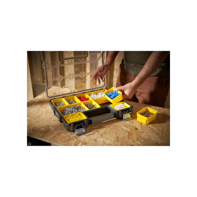 L'organiseur étanche Fatmax STANLEY est le compagnon qu'il vous faut pour ranger votre visserie en fonction de vos besoins. Ce coffret contient 2 grands gobelets et 8 bonnets. Ils sont tous amovibles afin de vous permettre d'organiser l'espace à votre guise. Cet élément de rangement est étanche pour protéger le contenu et des loquets en métal assure un renforcement maximal.