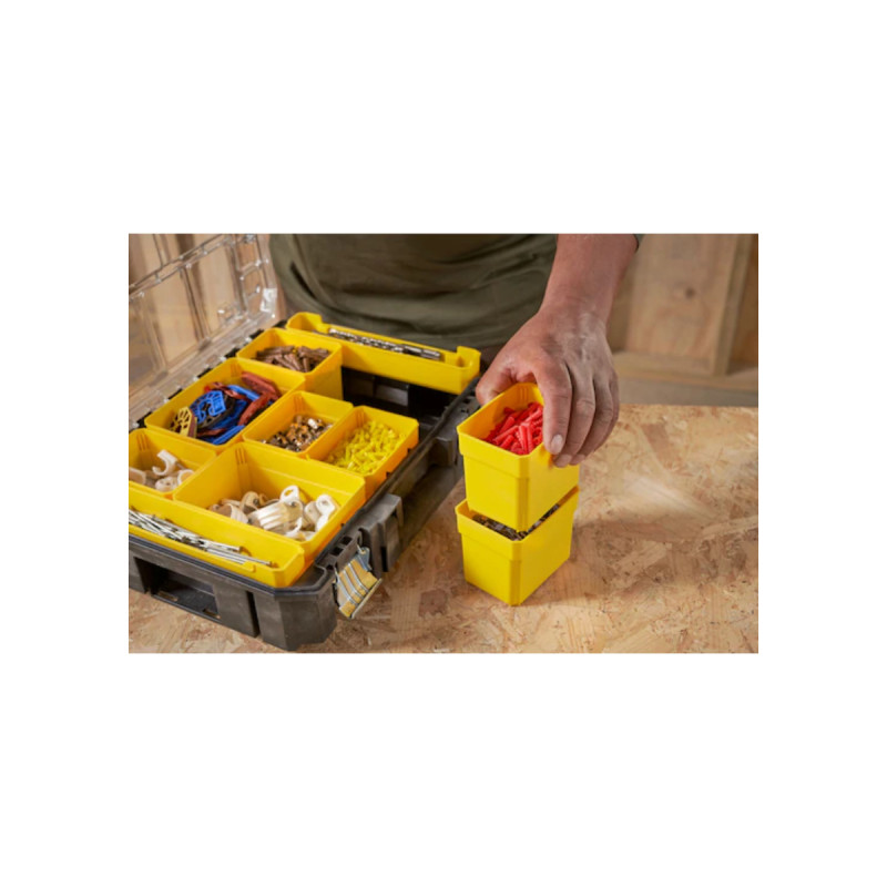 L'organiseur Pro-Stack Fatmax STANLEY est composé de godets amovibles qui vous permettent de modifier l'intérieur du coffret ou de les sortir lors de vos travaux. Cet élément de rangement est idéal pour de la visserie ou des petites pièces, avec une charge supportée maximale de 20 kg. De plus, l'organiseur est compatible avec le système Pro-Stack de Stanley si vous souhaitez vous connecter à d'autres produits de la gamme.