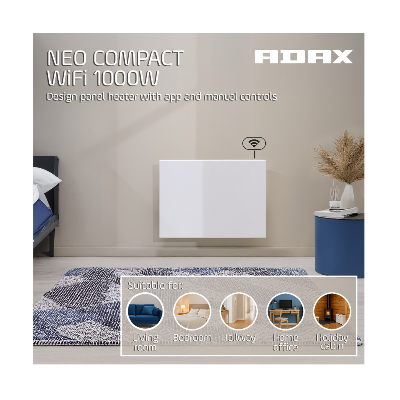 Grâce à son thermostat Wi-Fi intégré, vous pouvez ajuster la température depuis votre smartphone via l’application Wi-Fi Adax, que vous soyez à la maison, au bureau ou même dans votre chalet. En cas de perte de Wi-Fi, il évidemment possible de régler le thermostat de manière classique. Sa conception IP24 le rend résistant aux éclaboussures, avec une double isolation et une protection contre la surchauffe. Ce radiateur a été fabriqué avec une électricité 100% durable et il répond également à la réglementation Ecodesign 2018 pour une performance énergétique optimale. La gamme Neo Compact reprend les points forts de la gamme Neo classique en proposant des radiateurs plus compacts capables de trouver leur place dans toutes les pièces, qu'importe leur taille.