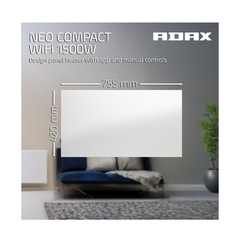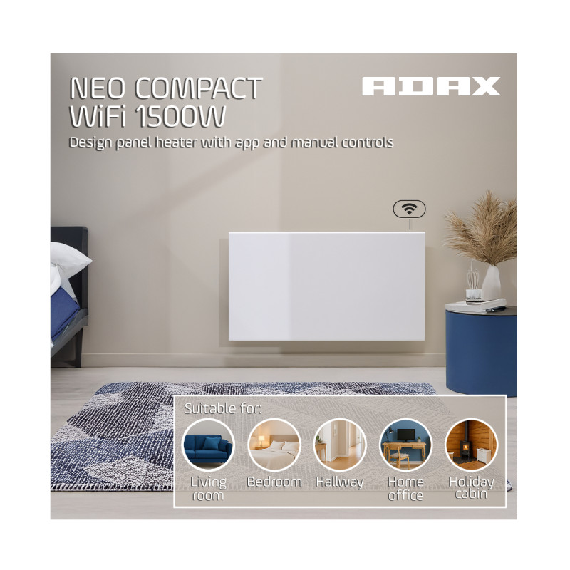 Grâce à son thermostat Wi-Fi intégré, vous pouvez ajuster la température depuis votre smartphone via l’application Wi-Fi Adax, que vous soyez à la maison, au bureau ou même dans votre chalet. En cas de perte de Wi-Fi, il évidemment possible de régler le thermostat de manière classique. Sa conception IP24 le rend résistant aux éclaboussures, avec une double isolation et une protection contre la surchauffe. Ce radiateur a été fabriqué avec une électricité 100% durable et il répond également à la réglementation Ecodesign 2018 pour une performance énergétique optimale. La gamme Neo Compact reprend les points forts de la gamme Neo classique en proposant des radiateurs plus compacts capables de trouver leur place dans toutes les pièces, qu'importe leur taille.