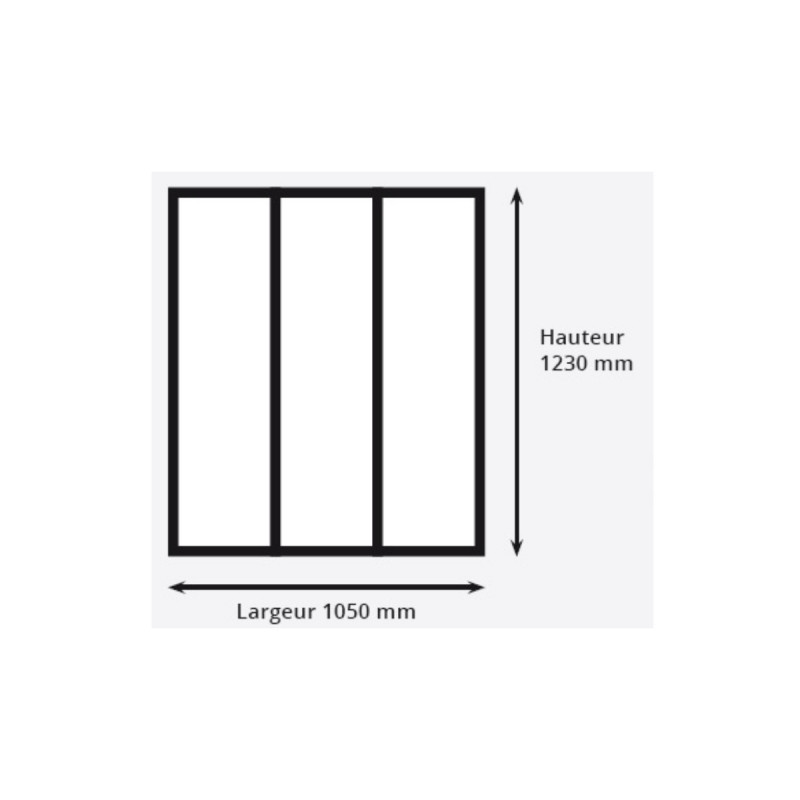 La verrière d'intérieur en aluminium - 3 vitrages avec traverses décoratives - Noir - 105 x 123 cm est l’élément parfait pour cloisonner vos espaces tout en conservant la luminosité naturelle. Son design élégant et ses proportions harmonieuses en font un véritable atout esthétique pour votre intérieur. Grâce à ses profils en aluminium ultra-fins de seulement 28 mm en face vue, elle offre un rendu moderne et épuré qui s’intègre facilement à tous les styles de décoration. De plus, les traverses horizontales décoratives ajoutent de la personnalité à la verrière. Cette verrière est facile à assembler et à poser, s’adaptant à tous types de supports. Elle est livrée avec ses vitrages et ses fixations murales pour une installation simplifiée. Son installation s’adapte à votre projet : elle peut être posée en nez-de-cloison sans ajout de profil, ou en angle avec l’ajout du profil de poteau d’angle (vendu séparément). Son aluminium thermolaqué noir (RAL 9005) à la finition fine texture (sablé) lui confère une grande résistance tout en sublimant son design. Cette verrière est également réparable et déplaçable, offrant une flexibilité appréciable en cas de modification de votre aménagement intérieur. Fabriquée et conçue en France, elle garantit une qualité irréprochable et une durabilité optimale.