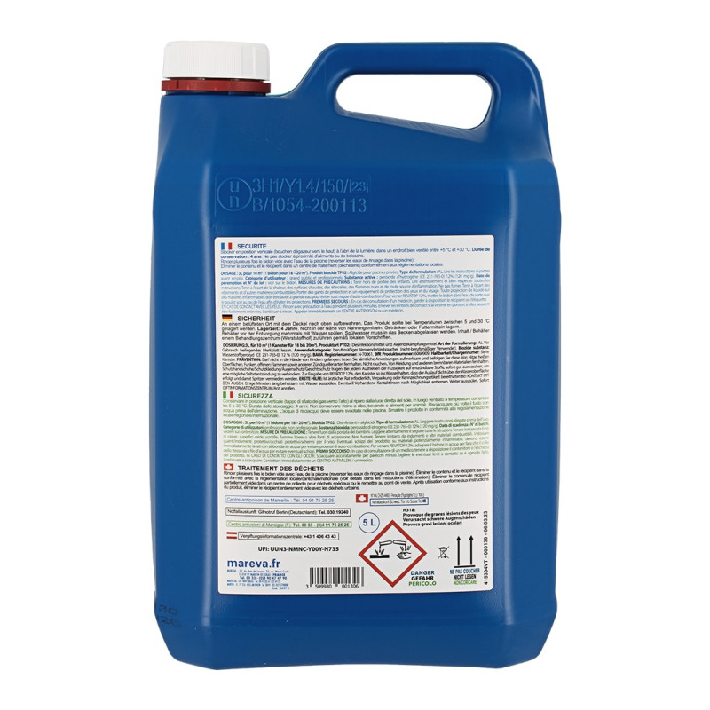 L'algicide MAREVA REVATOP 12 % - 5 L est un clarifiant choc prêt à l'emploi composé d'oxygène actif, qui vous permettra en quelques heures après son application de désinfecter et de rendre sa beauté à votre piscine de manière ultra rapide, efficace et puissante, en retirant les algues vertes. Revatop est particulièrement efficace pour les traitements chocs courants ou clarifier l'eau verte d'une piscine en quelques heures seulement et lui rendre sa couleur bleutée ; cet anti-algues est curatif et préventif avec un effet immédiat qui est visible dans les minutes qui suivent. Son action est instantanée, l’eau redevient belle très rapidement contrairement à un traitement choc de chlore où l’on doit attendre 24h, on peut déjà se baigner de nouveau quelques heures plus tard. L’avantage du Revatop est qu’on change de la molécule du chlore, molécule à laquelle les bactéries s’accoutument. A base d’oxygène actif, il n’apporte que de l’oxygène et de l’eau pure et se révèle très efficace. De plus, il évite tout apport de stabilisant (composant chimique à limiter dans sa piscine) et est compatible avec tous les traitements. Les traitements chocs doivent être réalisés toutes les 3,4 semaines en fonction de la fréquentation de votre piscine et de divers paramètres ; c’est l’occasion d’en faire un en évitant les désagréments du chlore. Ainsi vous pourrez profiter pleinement des joies de votre piscine durant l'été !