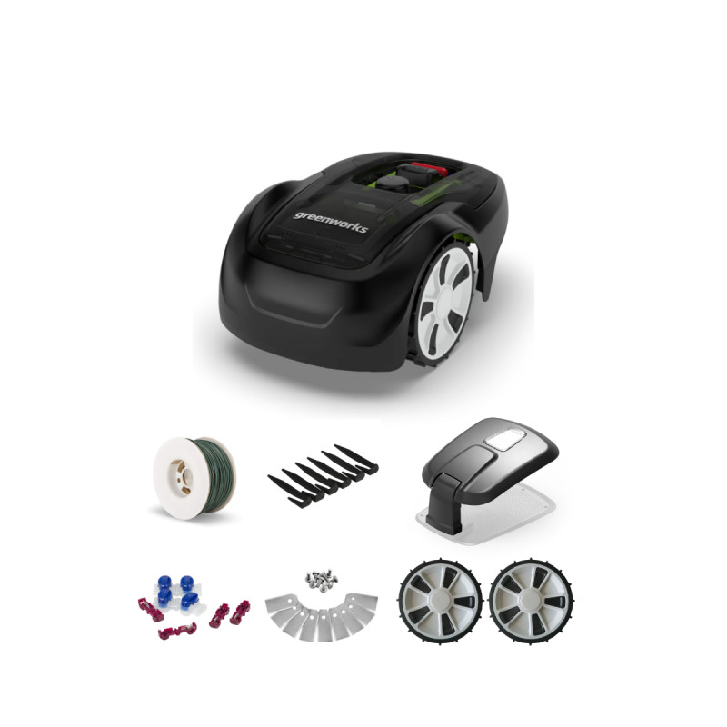Profitez d’un gazon impeccable sans effort grâce au robot tondeuse Optimow 7 de GREENWORKS qui s’accompagne ici d’un pack complet prêt à l’emploi incluant tous les accessoires nécessaires : un garage de protection, des lames et roues de rechange, un rouleau de 100 mètres de fil périphérique, des piquets de fixation et des connecteurs.