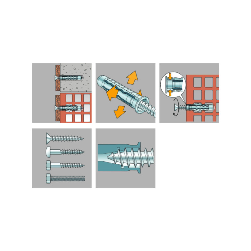 Le lot de 100 chevilles universelles FORCH 8x40 mm est la solution idéale pour des fixations fiables et polyvalentes, aussi bien en milieu domestique que professionnel. Grâce à leur conception en nylon haute résistance, ces chevilles s’adaptent à une large gamme de matériaux : béton, brique pleine, brique creuse, parpaing ou encore plaques de plâtre. Leur système d’expansion en quatre directions assure une tenue optimale dans les supports pleins et un verrouillage efficace dans les matériaux creux. Faciles à insérer, elles garantissent une fixation solide sans rotation grâce aux ailettes anti-torsion. Ces chevilles sont compatibles avec les vis à bois ou à filetage métrique, ce qui les rend particulièrement pratiques pour la fixation d'étagères, de cadres, de luminaires ou d’éléments de mobilier.