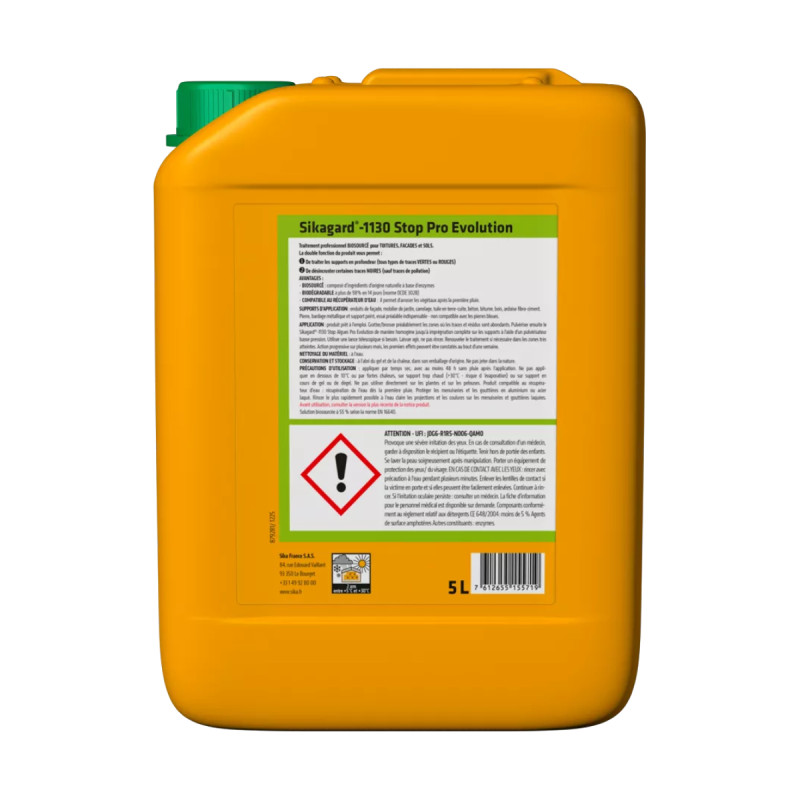 Conçu dans une démarche plus responsable, le Sikagard-1130 Stop Pro Evolution est formulé sans ammonium quaternaire, sans eau de javel ni peroxyde d’hydrogène. Il est biodégradable selon la norme OCDE 302B et biosourcé à 55 % selon la norme EN 16640, ce qui le rend compatible avec les récupérateurs d’eau. L’arrosage des végétaux est possible dès la première pluie après application.