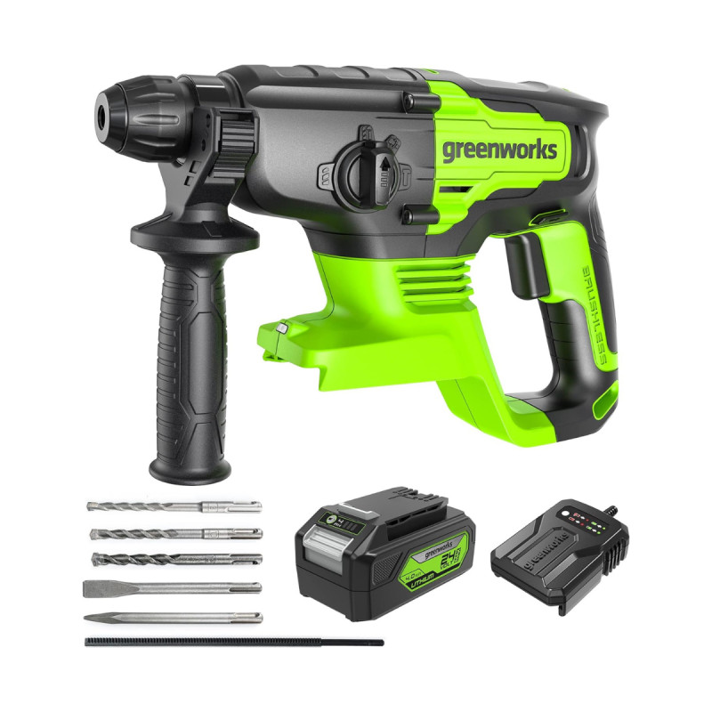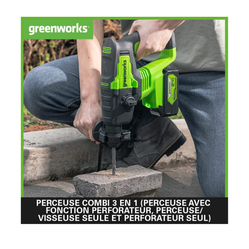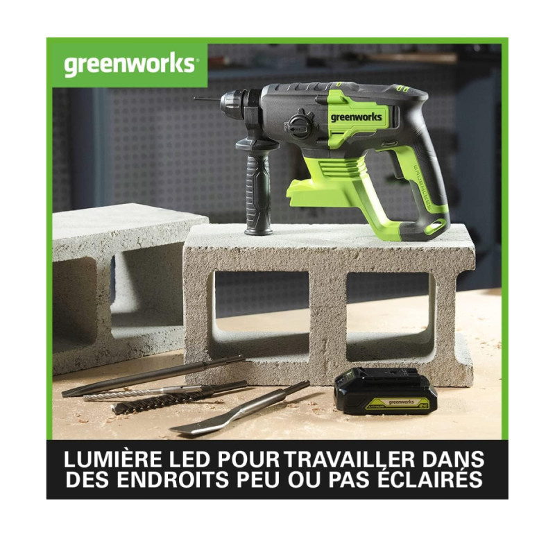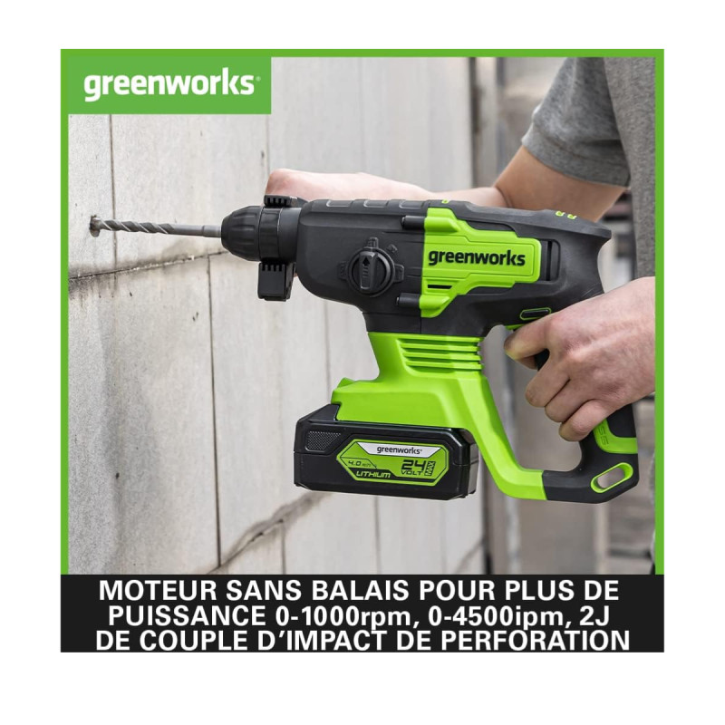 Perforateur SDS Brushless 24V GREENWORKS - 2 joules - Batterie 4,0Ah et chargeur - GD24SDS2K4