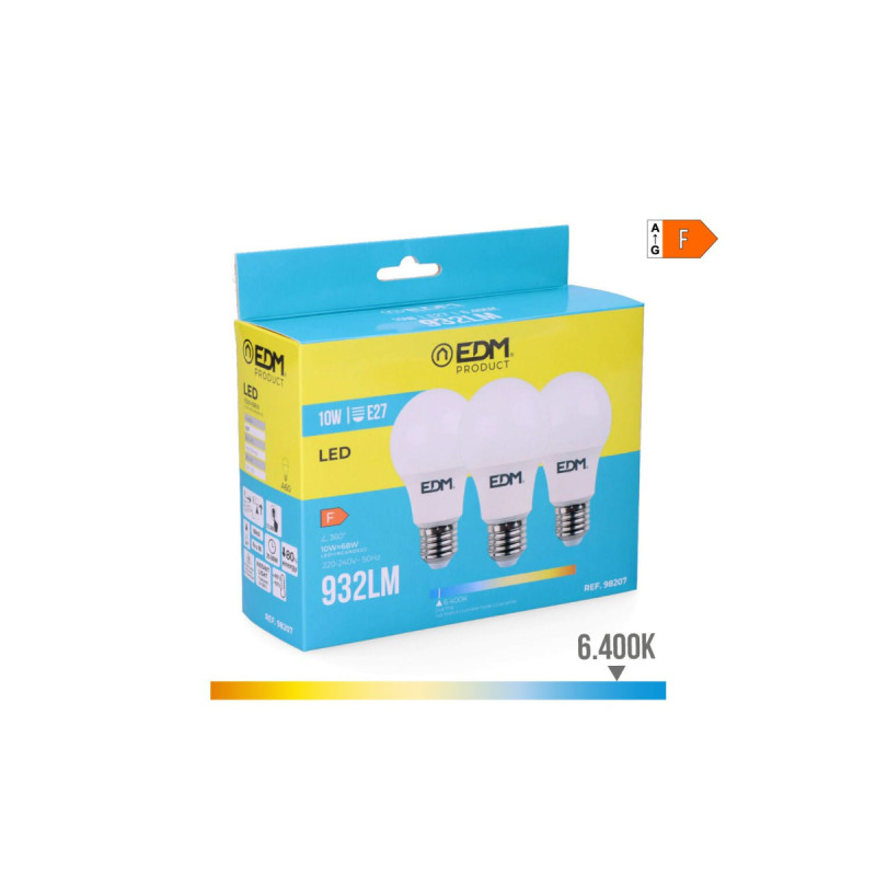 Kit 3 ampoules LED E27 10W 932lm 6400K - Lumière froide - EDM - Réf 98207