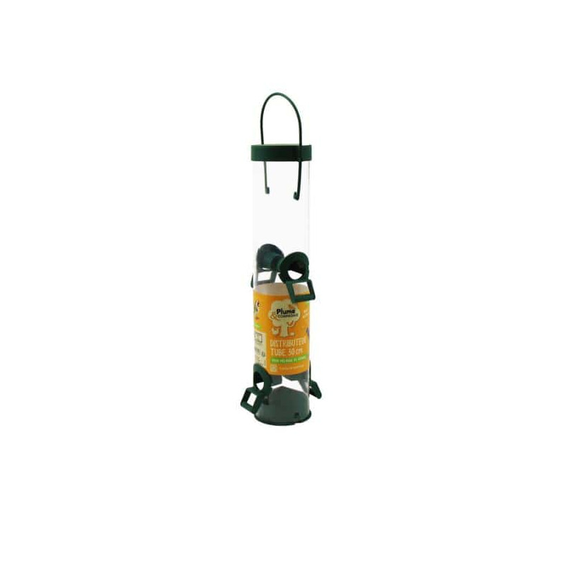 Distributeur tube pour mélange de graines Plume et compagnie 500g pour mettre à disposition des oiseaux de la nature des mélanges de graines. En été, les oiseaux se nourrissent d'insectes alors qu'en hiver, leur régime alimentaire change pour se nourrir principalement de graines. En effet, leurs ressources alimentaires dites "naturelles" ont tendance à diminuer, c'est pour quoi il est important de leur apporter une aide.