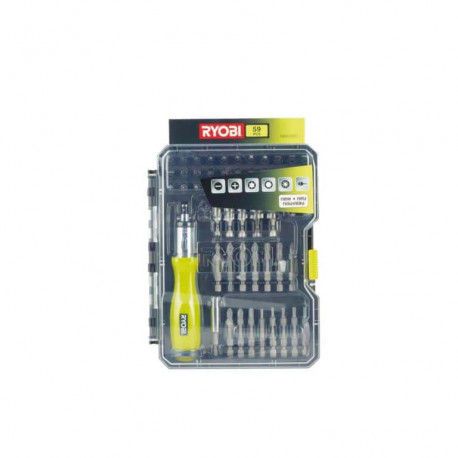 Coffret RYOBI 59 accessoires de vissage-boulonnage avec tournevis à cliquet RAK59SD idéal pour avoir à disposition tous les accessoires nécessaires pour la réalisation de vos travaux.
