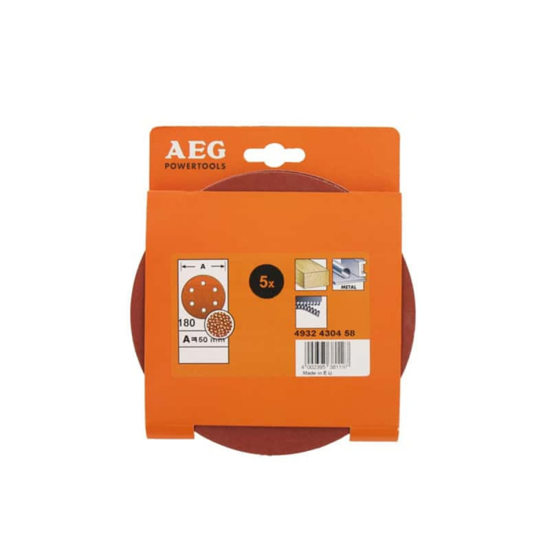 Kit 5 disques abrasifs AEG grain 180 150mm 4932430458, auto-agrippants, ces disques sont conçus pour une utilisation sur bois et métaux.