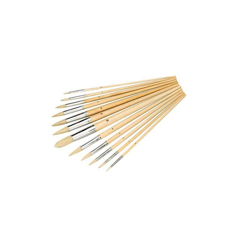 Pack 12 pinceaux d'artiste extrémités pointues en soies naturelles et manche en bois. Idéal pour les travaux de finition, d'apprêt et de peinture.