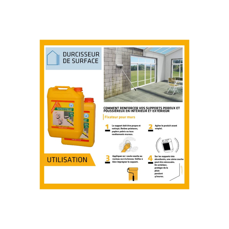 Fixateur pour mur SIKA - 2L est une dispersion de résines prête à l'emploi utilisé pour renforcer superficiellement les supports poreux et poussiéreux. Le produit est incolore après le séchage, il permet de durcir les surfaces en matériaux courants de la construction tels que le plâtre, mortier, brique, terre cuite, pierre...
