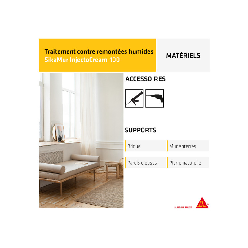 Kit Pro anti-humidité SIKA SikaMur InjectoCream - 5m, nouveau concept pour maîtriser les remontées d’humidité dans les murs. Ce kit complet permet l'application d'une crème d'injection spécialement développée pour le traitement des remontées capillaires dans pratiquement tous les types de murs en maçonnerie (briques, pierres naturelles, parois creuses, murs enterrés, caves, sous-sols, murs de remblais en moellons...) Sa formule concentrée avec environ 80% de matières actives donne des résultats beaucoup plus efficaces comparé à des produits moins concentrés. Une fois injecté, le produit se diffuse dans le mur humide pour former une barrière bloquant l'eau et empêchant l'apparition d'humidité. Prête à l'emploi, elle est facile d'utilisation avec un faible risque d'erreur de manipulation, même pour un novice.