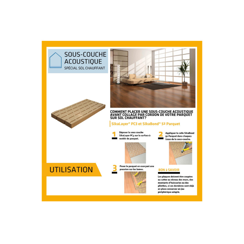 La sous couche acoustique SIKA SikaLayer PC3 - 12m2 est destinée à coller du parquet sur des sols chauffants, dans tous locaux non humides permettant la pose de parquet dont le classement UPEC est défini dans l’article 4 du DTU 51.2 P1-1 « Parquets collés ». L'application est facile et permet une bonne isolation des bruits de choc.
