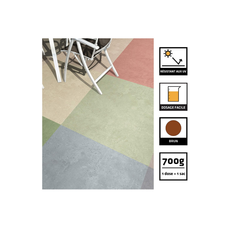 Ce colorant en poudre pour ciment, chaux et plâtre SIKA SikaCem Color - Brun - 700g colorera tous vos béton, mortier et enduits. Vous pourrez ainsi facilement colorer vos mortiers de chape, mortiers de jointoiement, dalles béton et tout autre béton esthétique. Avec SikaCem® Color, un colorant en poudre constitué d'oxydes minéraux, obtenez une teinte coloré avec un effet naturel pour un résultat esthétique.