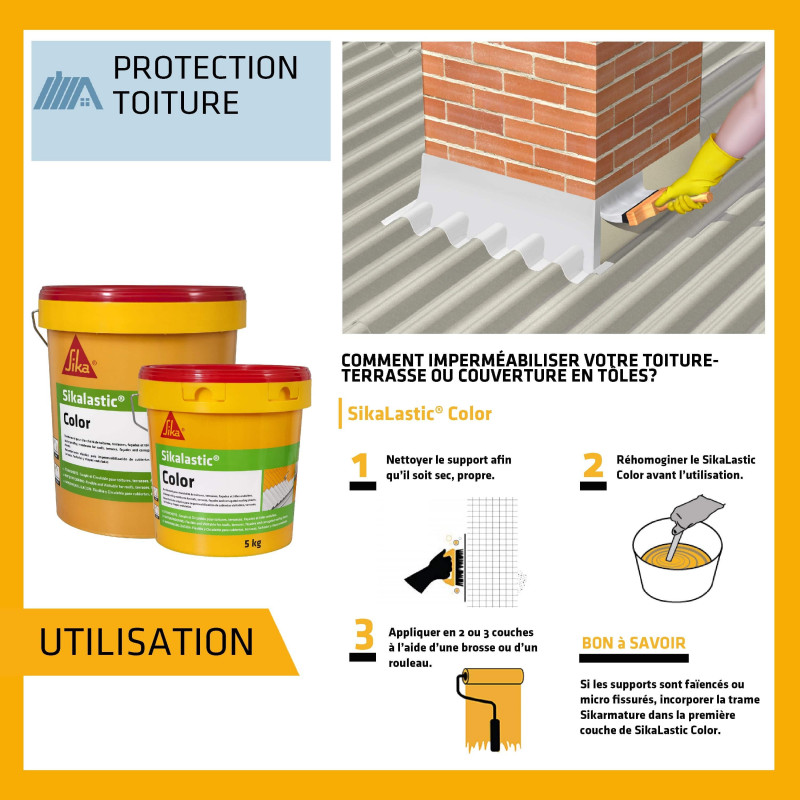 Revêtement souple imperméable toitures SIKA SikaLastic Color - Blanc - 20kg, facile à mettre en oeuvre, ce produit monocomposant est conçu pour imperméabiliser votre surface, il empêche la pénétration des eaux de pluie, tout en laissant respirer le support. Après séchage, le film du produit devient très élastique, ce qui lui permet de ponter les fissurations du support. Le produit peut être coloré avec des pigments pour peinture acrylique, vous pourrez alors choisir la couleur de votre surface pour plus de discretion.
