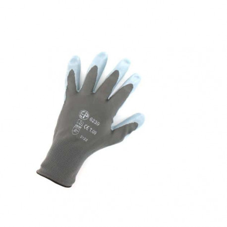 Gants Polyamide gris paume nitrile Taille L/9 EP 6239 Gant 100% polyamide tricoté, paume enduite de mousse de nitrile gris. Antidérapant, idéal pour les opérations délicates, assemblage de pièces, milieux huileux ou graisseux. Conforme aux normes EN388 et EN420. Ce gant est conforme au modèle de l'équipement de protection individuelle ayant fait l'objet de l'attestation CE de type 0075/485/162/02/01/0015 délivrée par CTC (organisme n° 0075). Conserver dans un endroit sec et aéré entre deux utilisations. Entretien : Aucun entretien particulier n'est préconisé pour ces types de gants