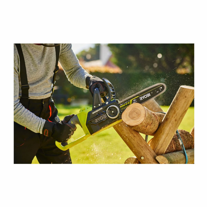 La tronçonneuse brushless RYOBI 18V One+ et ses accessoires : une batterie 5.0 Ah et un chargeur sont prêts à l'emploi pour une utilisation domestique, le bois de chauffage, le petit élagage et l'abattage d'arbre de petit diamètre. De plus, cet outil est équipé d'un moteur sans charbons de la technologie Brushless. Il possède donc un moteur puissant et peut effectuer des découpes élevées similaires aux appareils à moteur thermique.