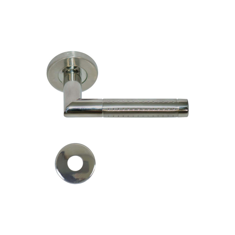 Poignées modèle Barsac avec rosaces borgnes - inox 304 bicolore brillant mat x2, ces poignées bicolores s'adapteront parfaitement à votre intérieur. Décorées de poinçons, elles ajouteront une touche moderne à votre intérieur.