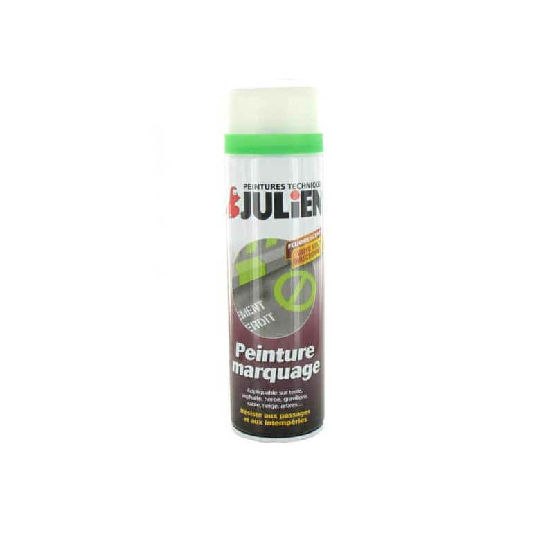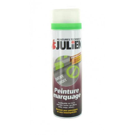 La peinture aérosol Julien marquage vert fluo a été spécialement élaborée pour marquer, tracer et repérer. Principalement utiliser dans les travaux publics, le bâtiment, l'industrie et le marquage forestier, cette peinture aérosol Julien marquage s'applique sur tous supports : terre, herbe, gravillons, sable, neige, arbres. La peinture Julien marquage sèche rapidement même sur fonds humides et résiste aux passages ainsi qu'aux intempéries.